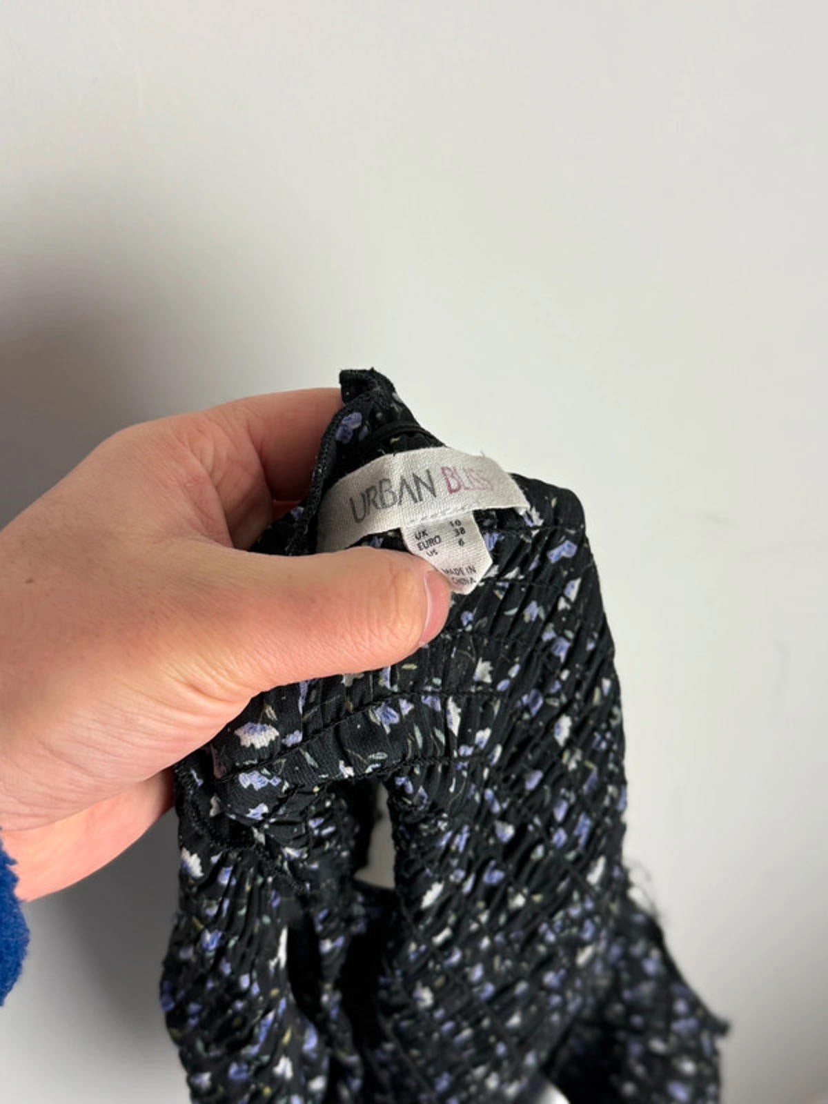 • Colour & print: Black base with a small scattered floral print in lilac/purple and white